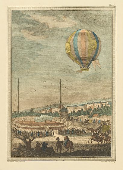 An etching of the Montgolfier balloon ascending in January 1784, image courtesy National Air and Space Museum, Smithsonian Institution