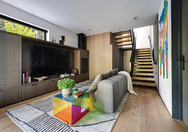 Borman was largely responsible, too, for the lighting effects, with special white glass globes interspersed throughout, and a series of arresting teardrop-like lights set over the kitchen island that provide both task and mood lighting. Meanwhile, interior designer Sylvestre Huerta of Interiors KD brought select artworks whose hues both complement and enliven rooms. Bold pops of color appear sparingly, but to great effect, as in a multi-hued plexiglass coffee table in the media room. And with nature all around, what’s outside appears inside as decor.