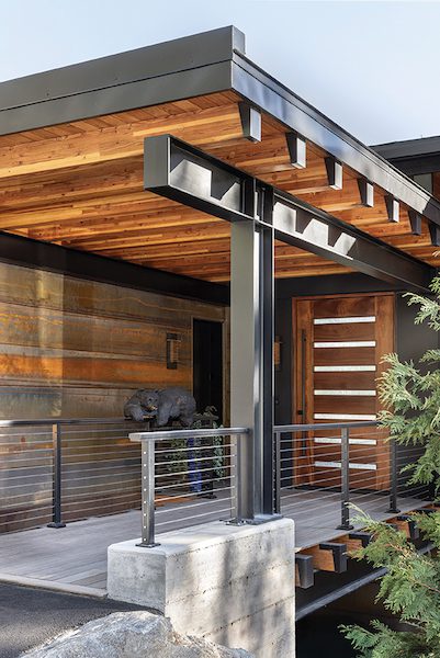 Visitors who make the easy lower-level transition from indoors to outdoors can turn and see that low-maintenance exterior: a mixed blend stone veneer, corten steel that naturally patinas over time, corrugated metal and exposed glulam structure with mixed-grain structural hemlock ceiling.