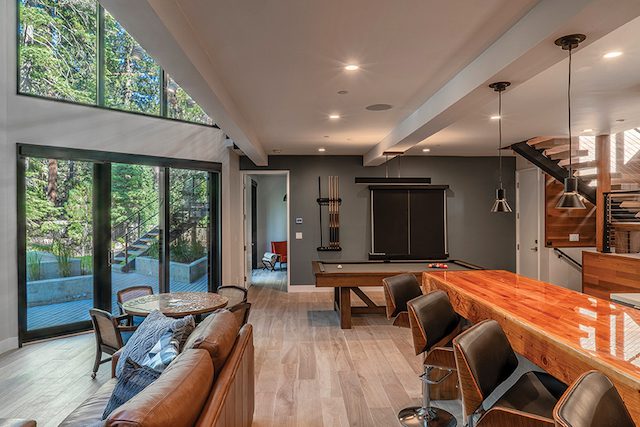 The game room interacts with the living room above and shares the large wall of glass that floods the house with natural light, photo by Ryan Hirschberg