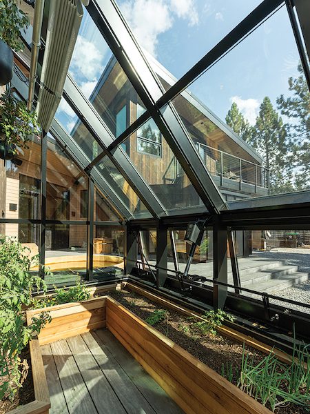• Objectives: The homeowners, who chose not to hire an architect because they wanted more control of the project, worked with South Lake Tahoe-based Sierra Sustainable Builders (SSB) to achieve their vision for a modern home that felt comfortable in its mountain landscape. Working closely with the owners, the SSB team provided durable exterior surfaces with the goal of creating an extremely sturdy and long-lasting home—a “100-plus-year build”—along with textures that complement the surrounding landscape. With energy efficiency in mind, the owners also decided to move away from natural gas and go all-electric, with a solar array covering the garage loft roof and ample battery storage.
