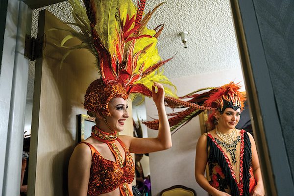 In the dressing room, every dancer stacks their costume pieces in a particular order so they can sprint off stage, down the dark hallway, peel one outfit off, then layer the next one on in time for the following number. Glittering jackets, feathers, tops and bottoms litter every surface of the room.
