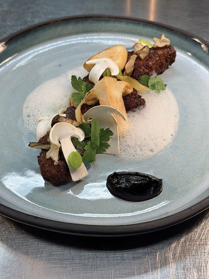 Toward the finish of the full chef’s tasting menu, Nyna’s brioche—a sweet and savory French toast topped with a healthy portion of sustainably raised Tsar Nicoulai caviar from the Sacramento area—is served with a pine cone bud scented syrup. Those opting for the wine pairing will enjoy a 27-year-old 1998 Sauternes with it, juxtaposing the salinity of the caviar with the sweetness of the wine.