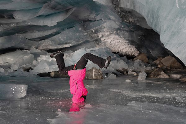 Hewitt-Demeyer with a headstand in an Alaskan ice cave, photo by Allie Rood