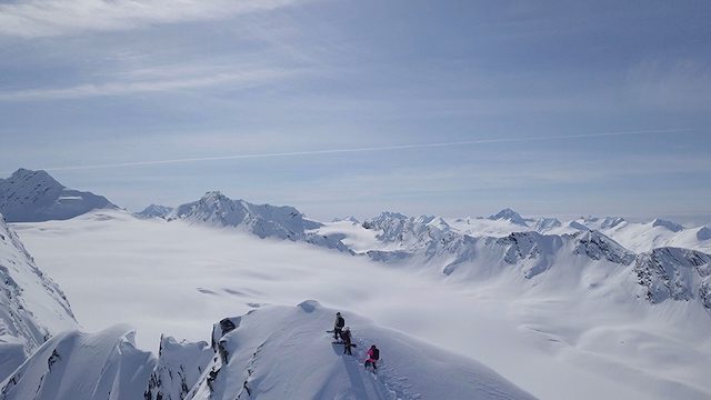 Jordan Chamberlain, Ashley Epis and Claire Hewitt-Demeyer prepare to descend a peak in the Chugach Mountains, photo by Sean Clawson